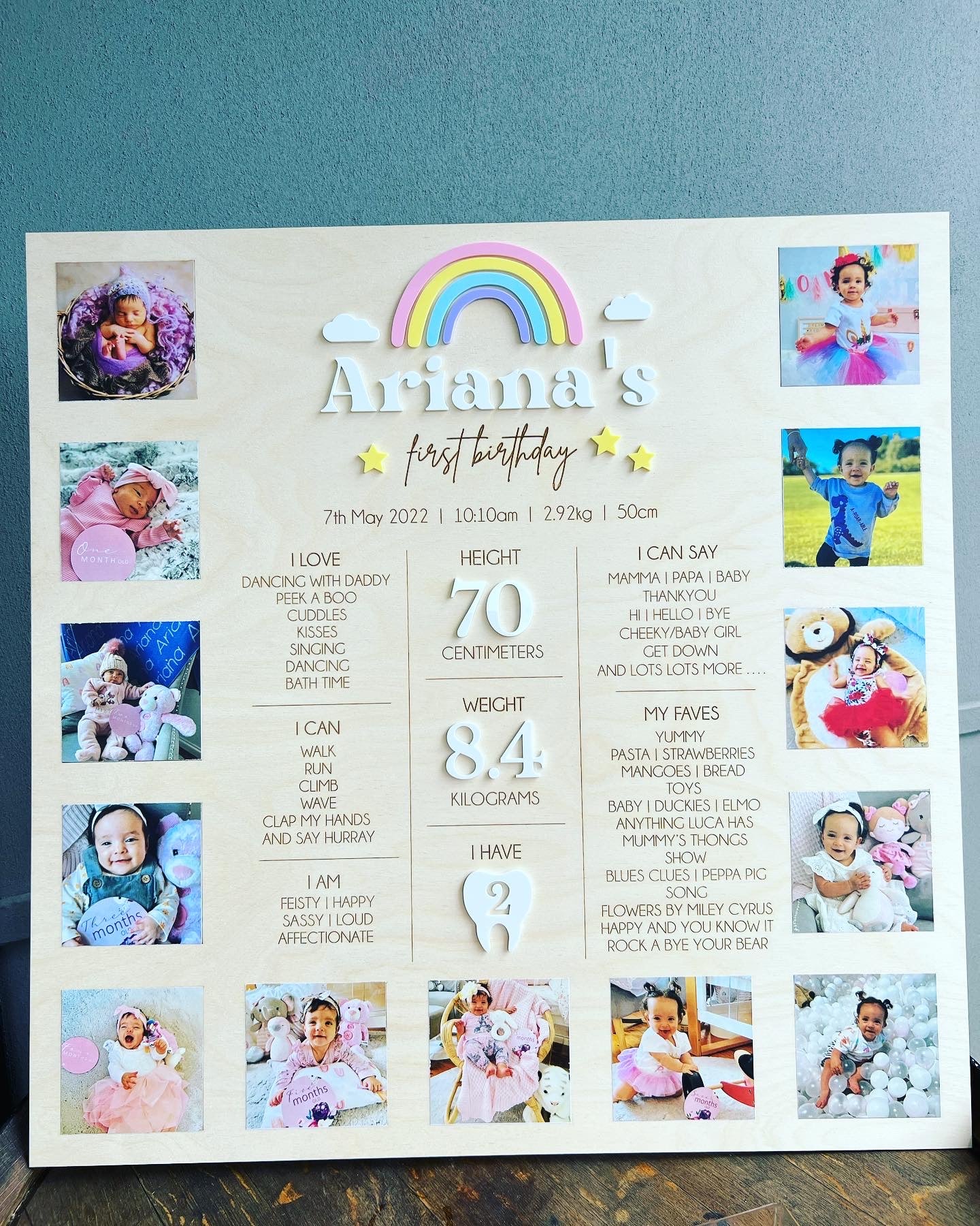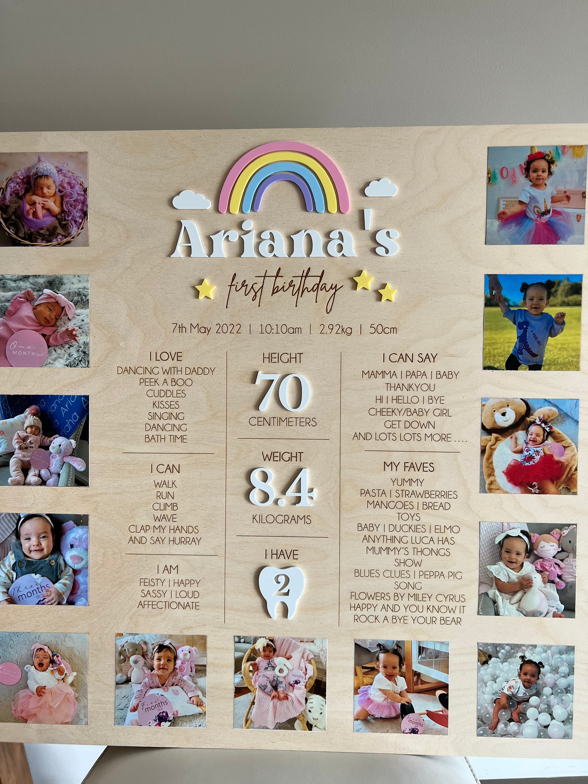 Our Timber Birthday Boards come in various sizes and include spaces for you to stick your own photos on from Birth - 1 Year Old and include the following Headings: