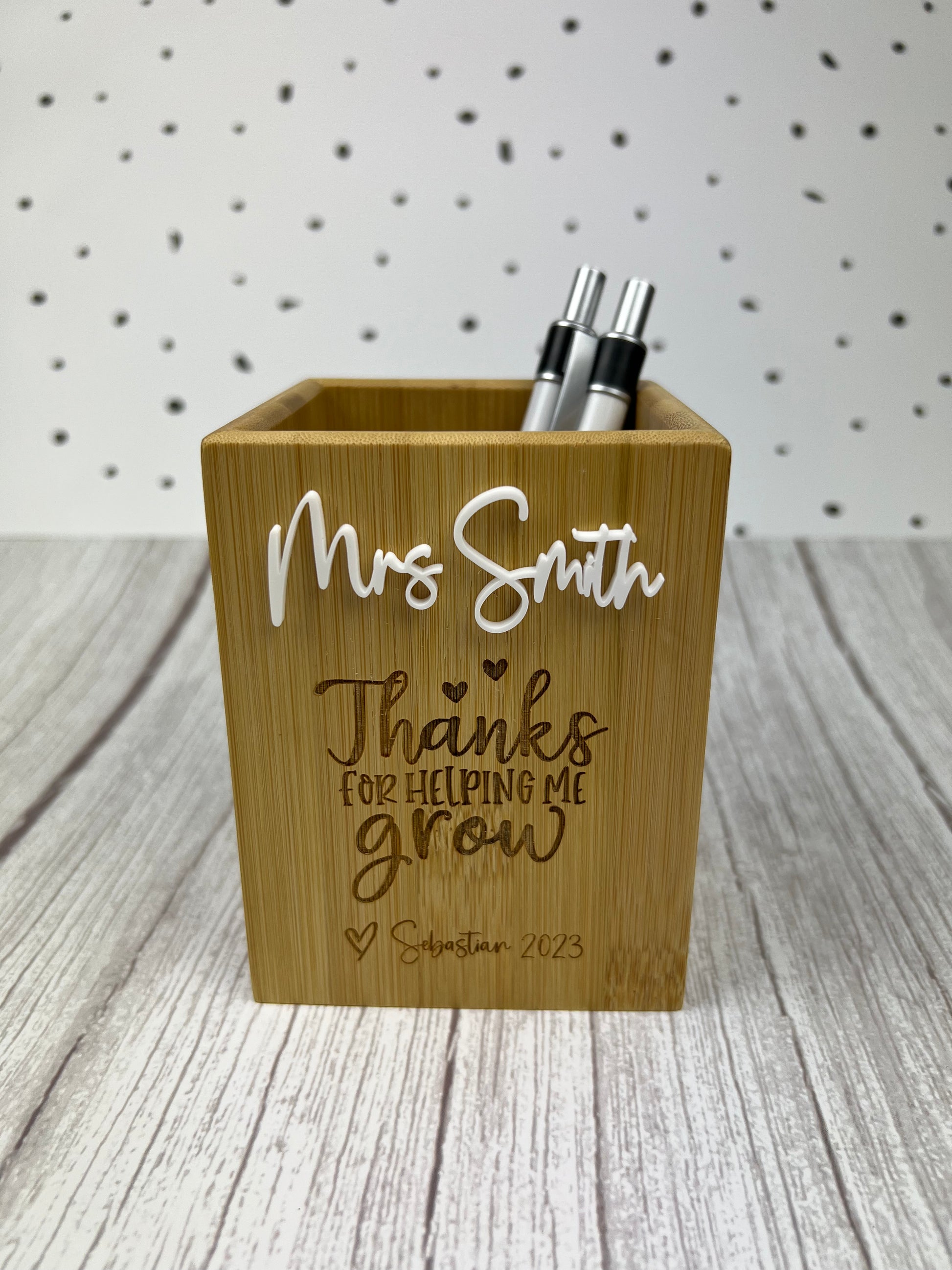 Say thank you with this personalised pencil holder! Crafted from durable, sustainable bamboo, this pencil cup makes a great teacher gift. Its unique look and feel will brighten up any desk.