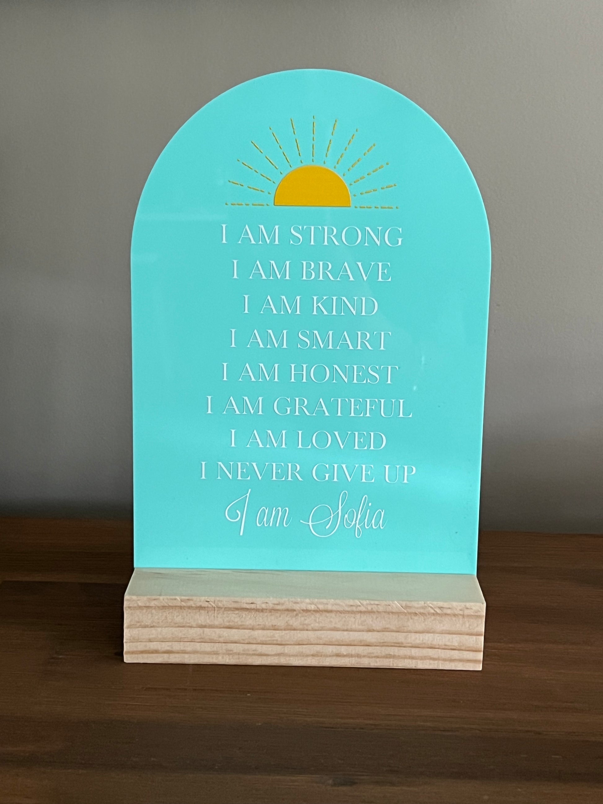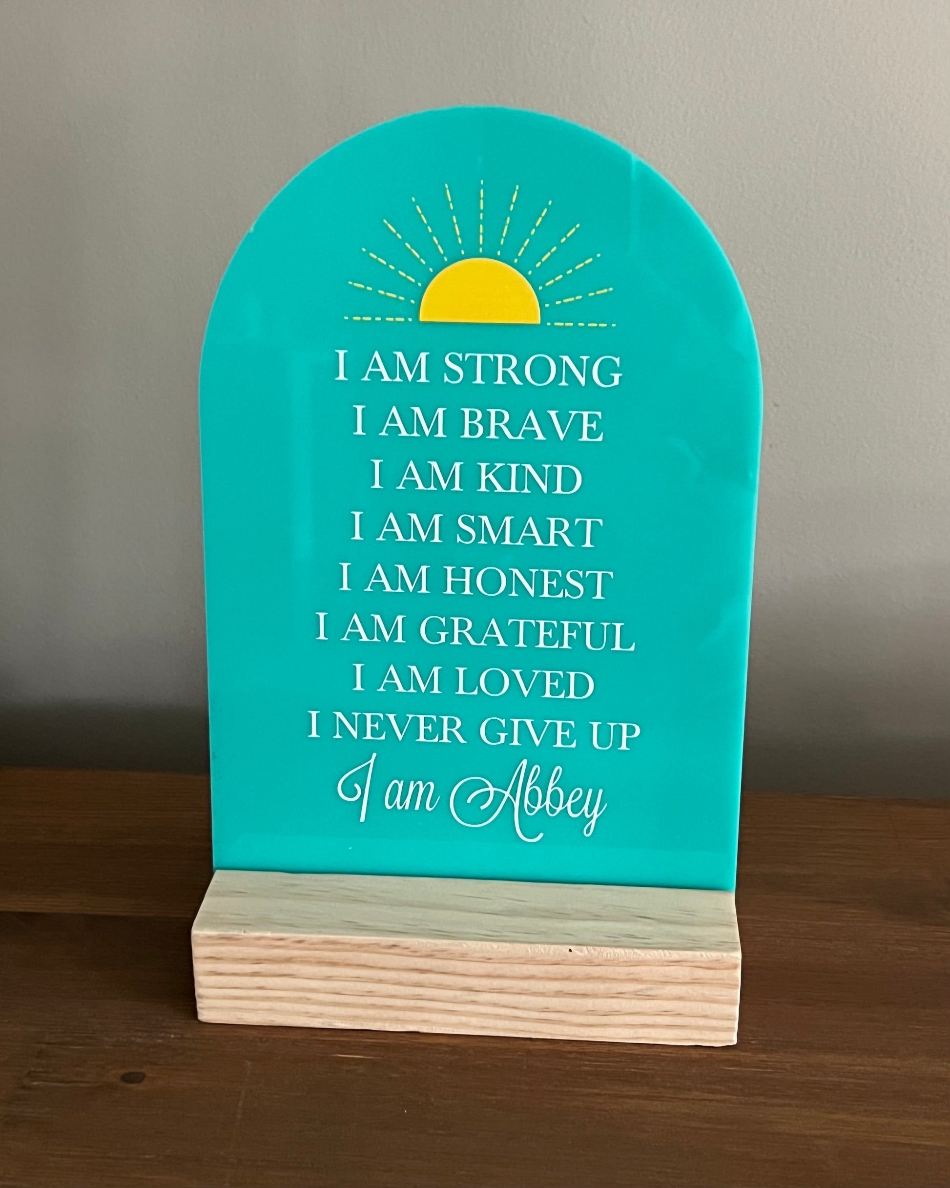 These acrylic affirmation boards are custom made to order & is printed with their name added to the end. It also features a colour printed design of your choice