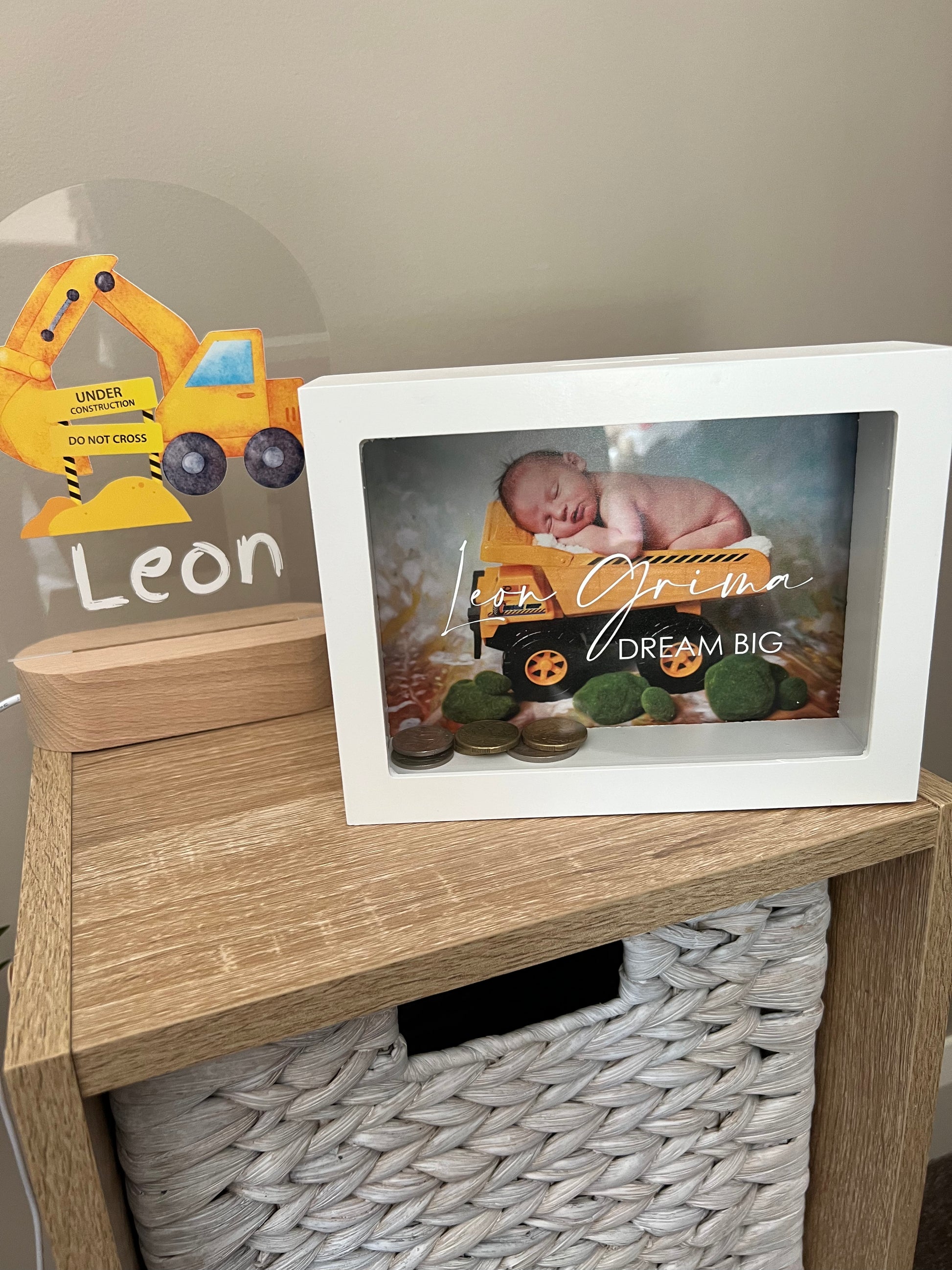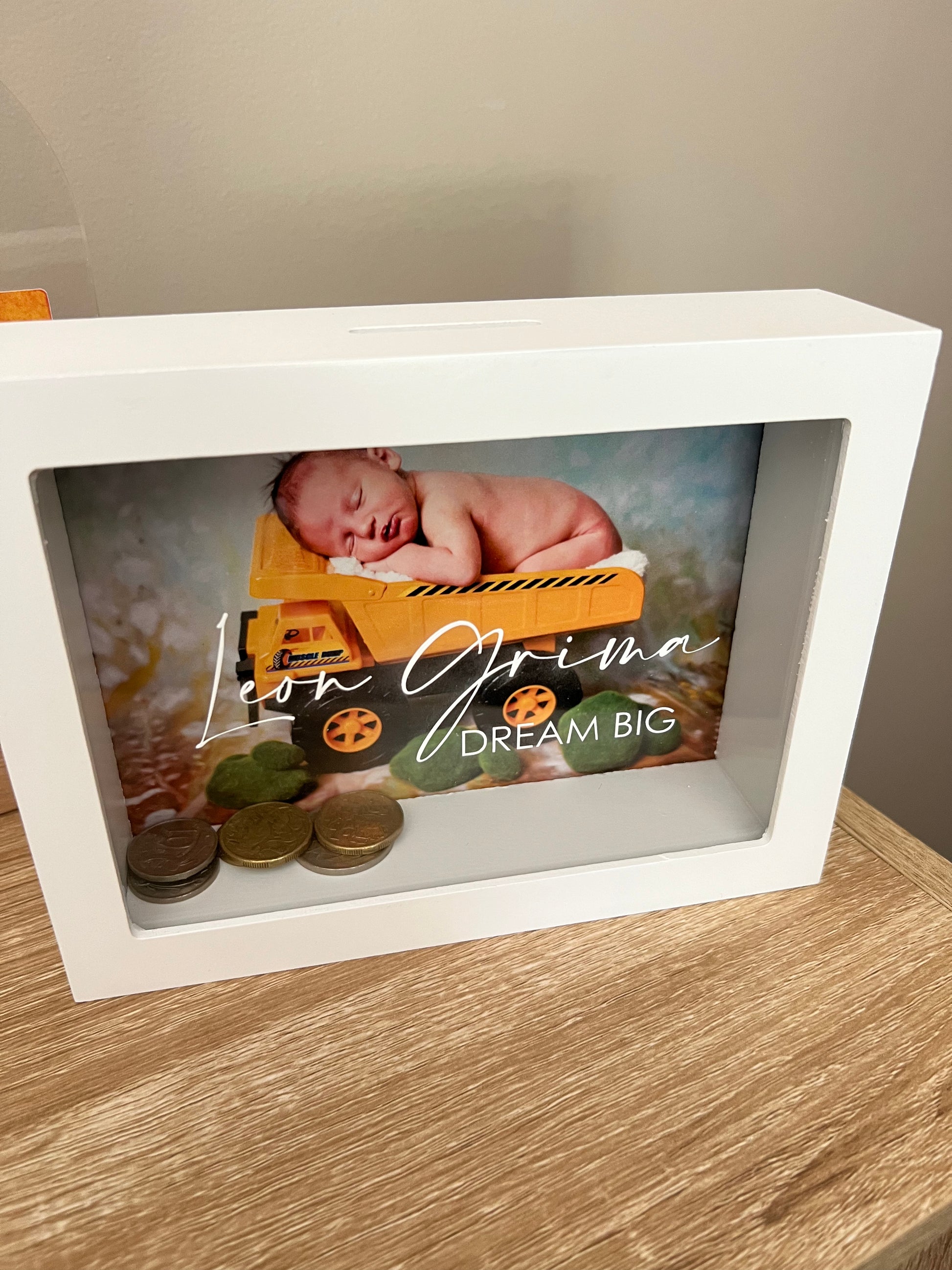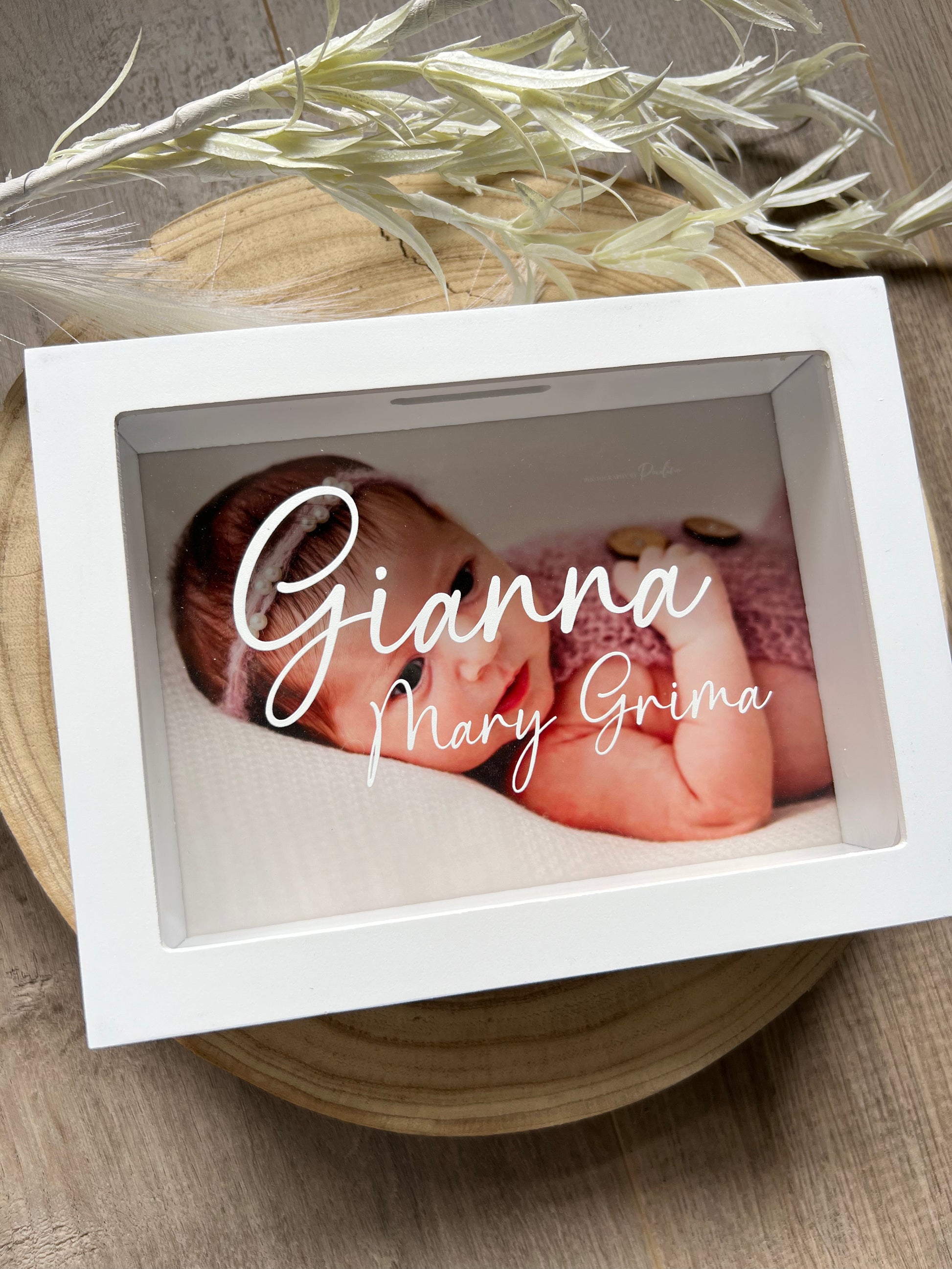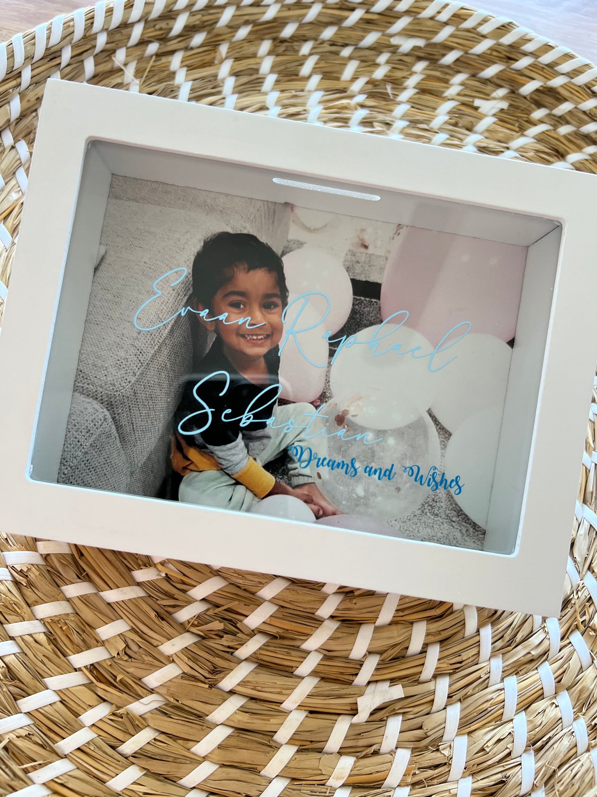 These Personalised Money Boxes have a White Wooden Frame with Glass Front & Backing Printed with a Picture or Photo of your Choice.