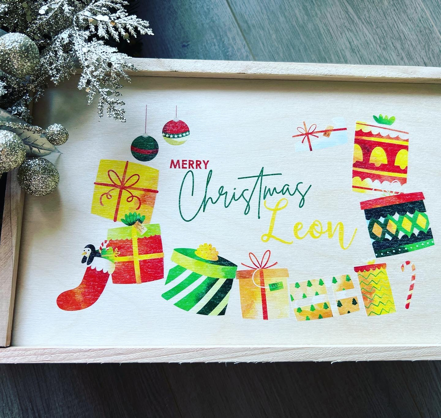Box has a sliding lid engraved with the Christmas Eve design & name of your choice.