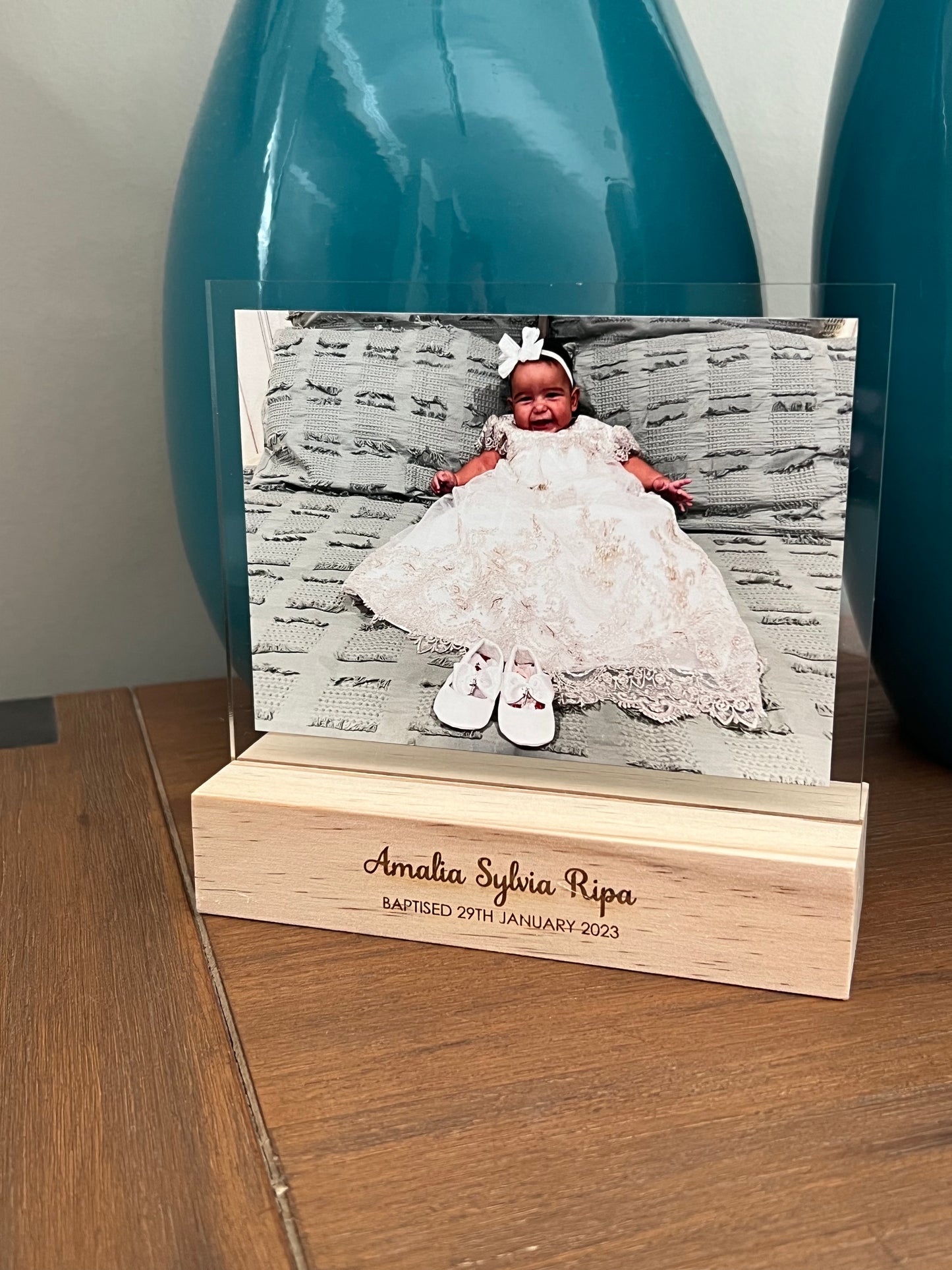 Photo is professionally printed in full colour onto 3mm clear acrylic and displayed on a gorgeous Oak wood base which is engraved with your choice of text.