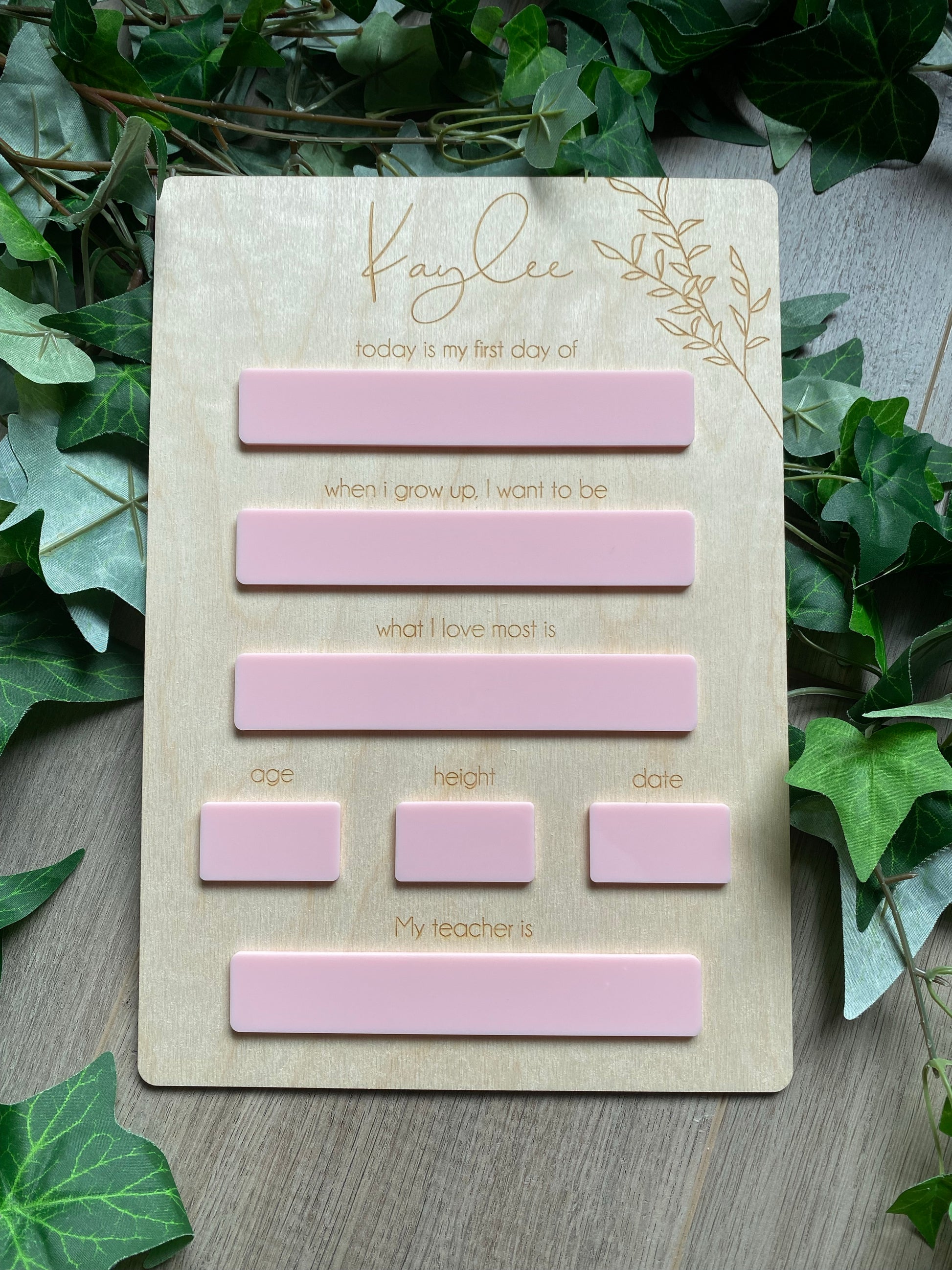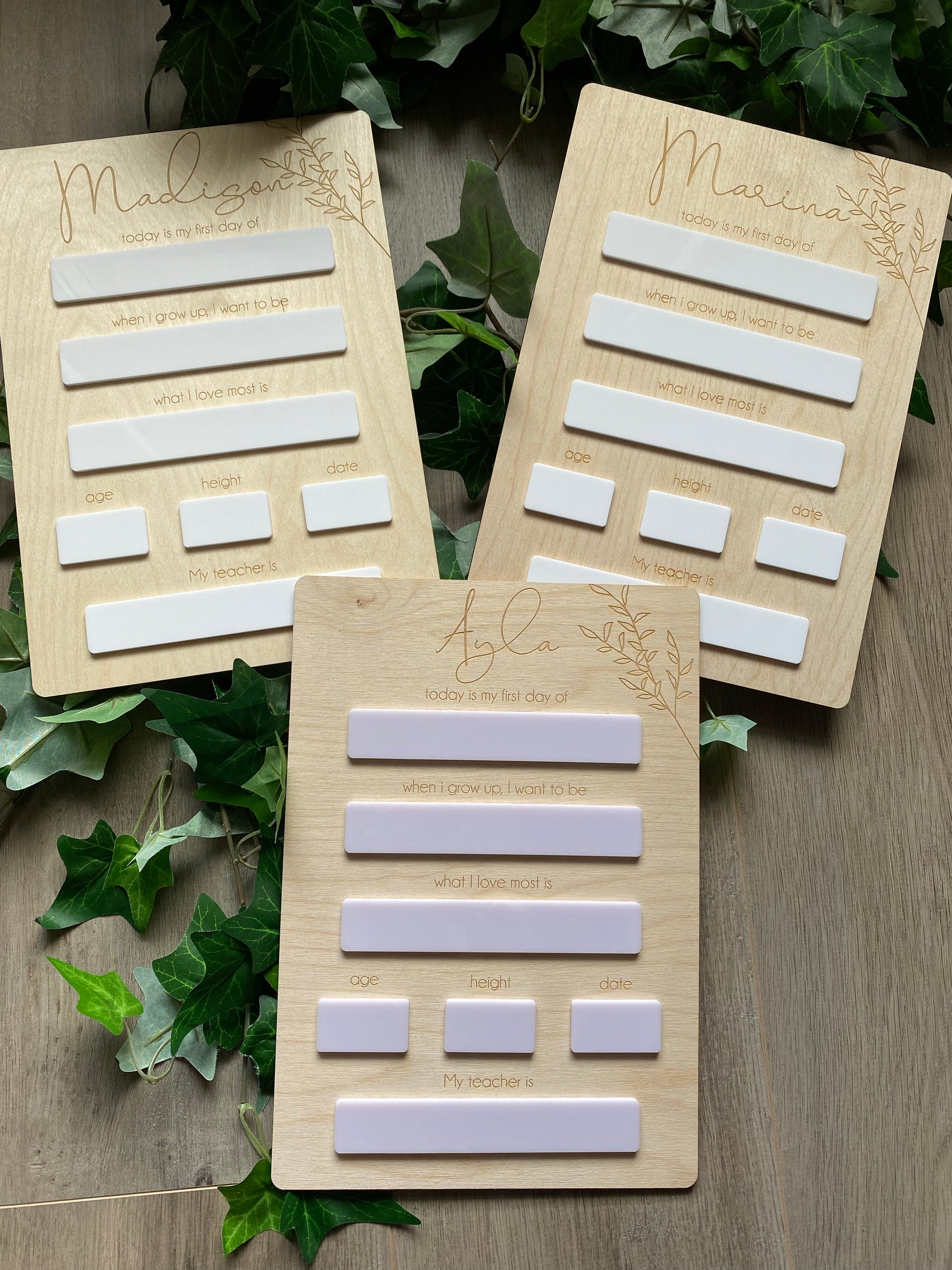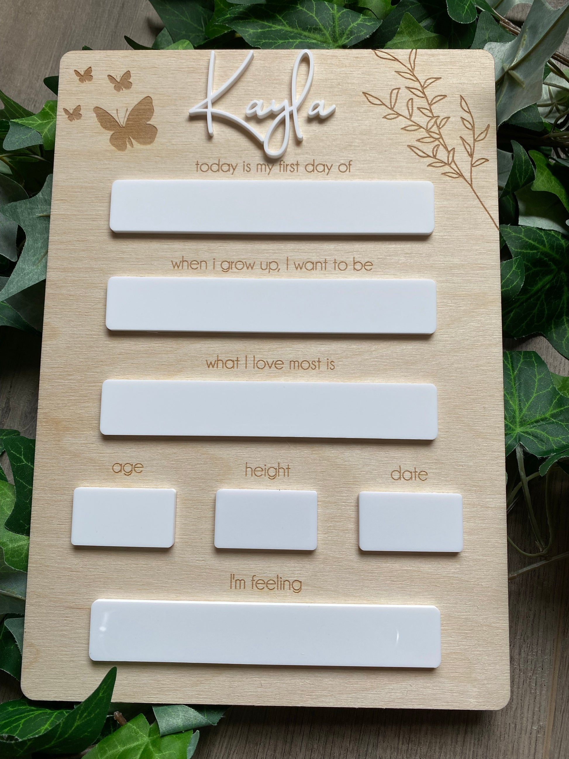 Whether it be First Day of School, Daycare, Sport of any other First, capture the memory with a photo using these boards to record the Memory, Age, Height, Date, Teacher & What I want to be when I grow up.